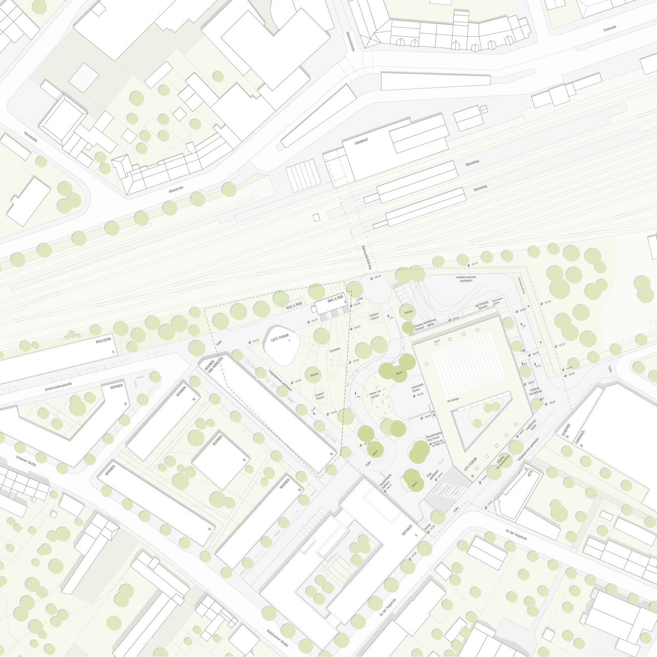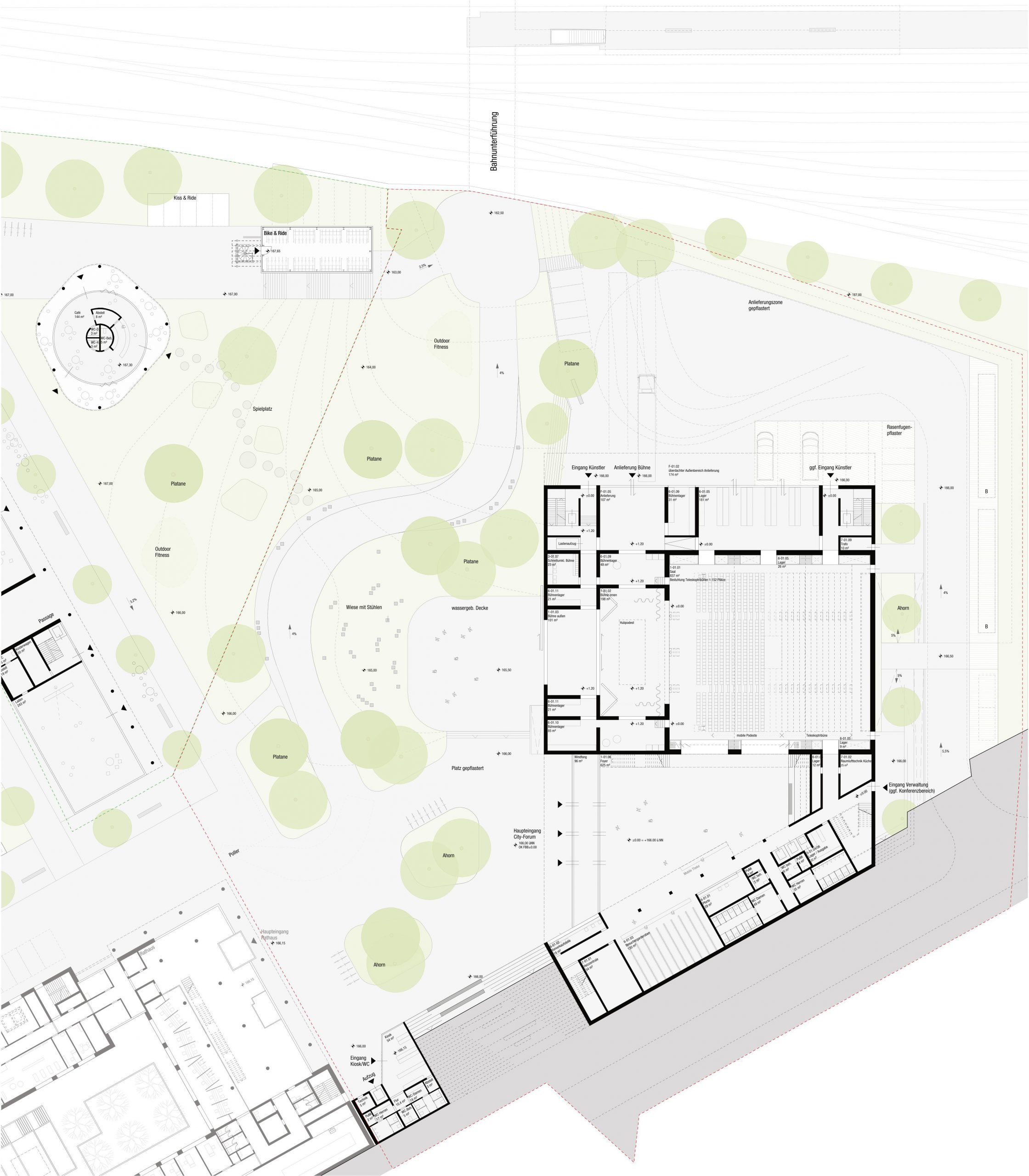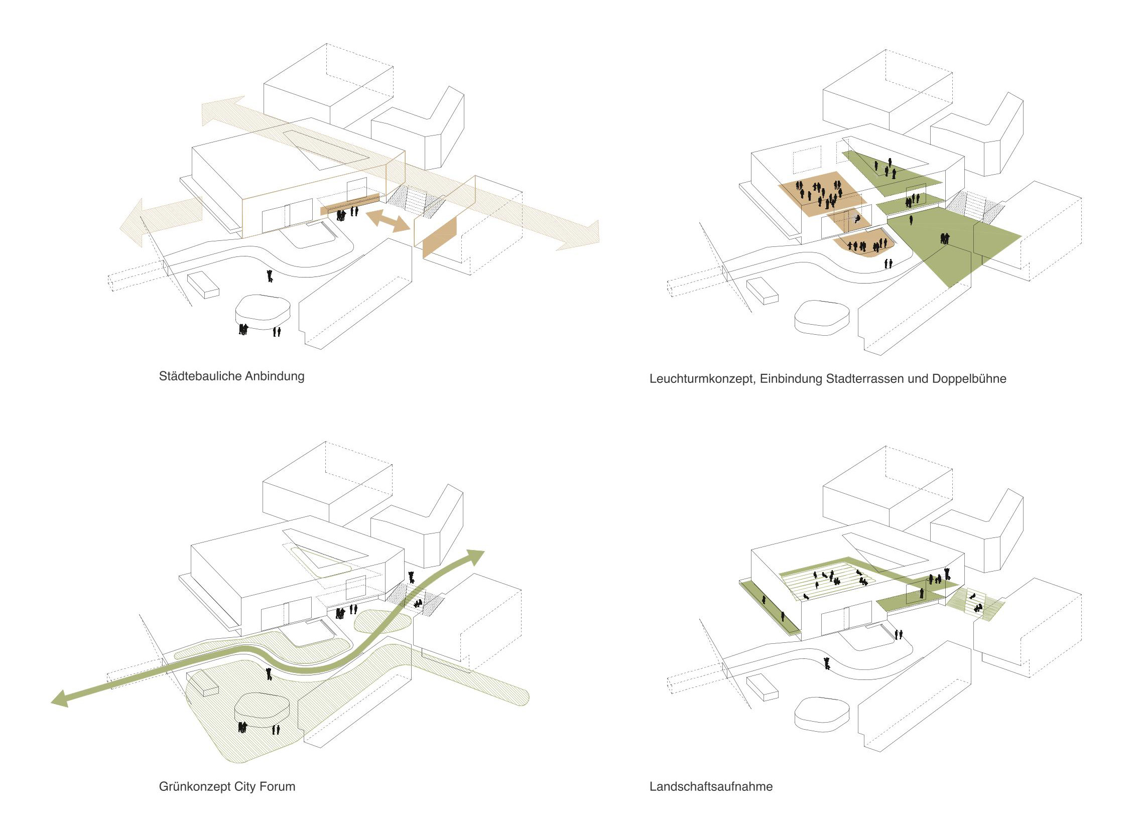 Das kompakte Gebäude erweitert die Fußgängerzone vom Alten Markt über die Bahnlinie bis zum Rathaus. Im Nordwesten fügt sich eine Mischnutzung an das neue Rathaus an, dient als Schallschutz für das Wohnquartier und bietet gastronomische Angebote im Erdgeschoss mit Blick auf die Außenbühne. Ein runder Pavillon im Nordwesten, als Café und Treffpunkt im Park, schließt den Platz ab. Im Süden flankiert eine neue Fußgängerstraße das Forum.