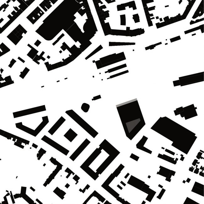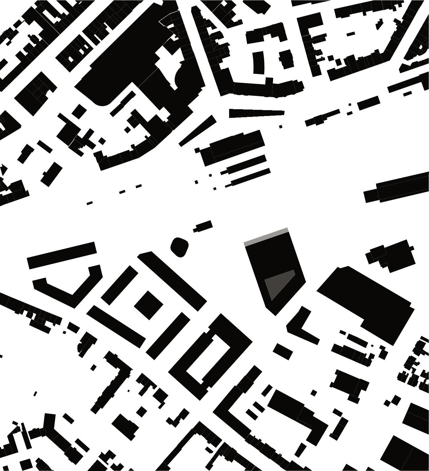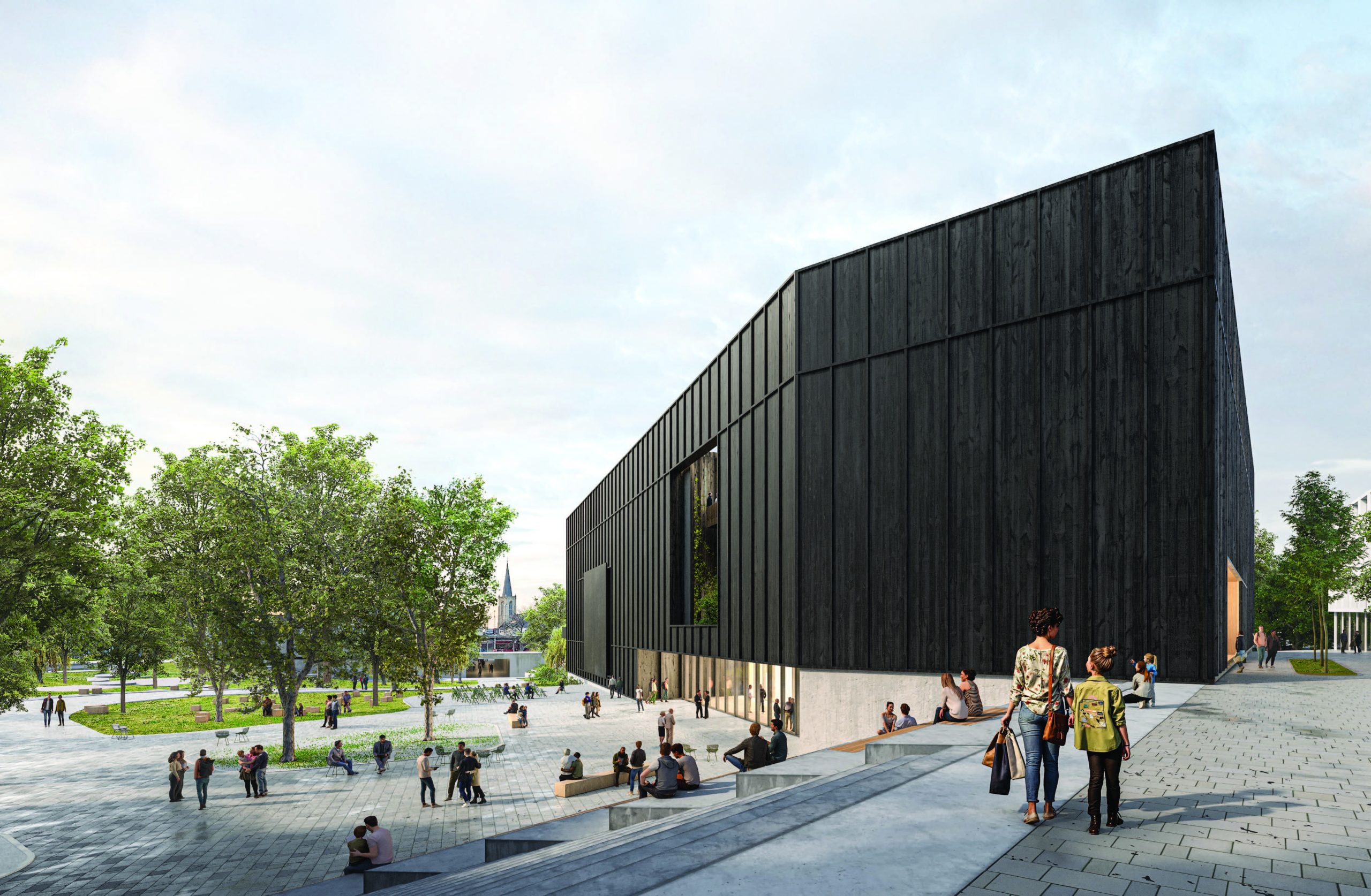 Das kompakte Gebäude erweitert die Fußgängerzone vom Alten Markt über die Bahnlinie bis zum Rathaus. Im Nordwesten fügt sich eine Mischnutzung an das neue Rathaus an, dient als Schallschutz für das Wohnquartier und bietet gastronomische Angebote im Erdgeschoss mit Blick auf die Außenbühne. Ein runder Pavillon im Nordwesten, als Café und Treffpunkt im Park, schließt den Platz ab. Im Süden flankiert eine neue Fußgängerstraße das Forum.