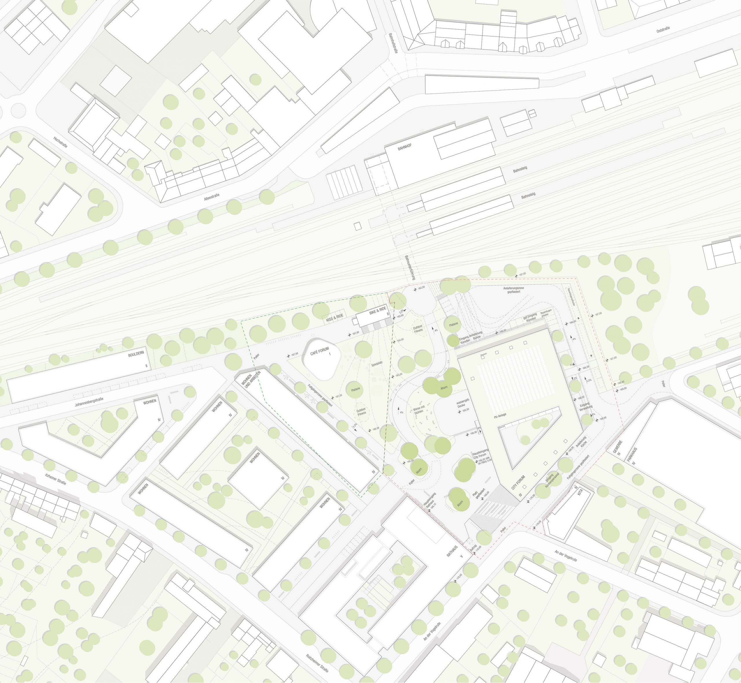 Ein breiter, barrierefreier Flanierweg verbindet die Innenstadt über den Bahnhof mit dem neuen Stadtquartier. Der Weg, der durch eine grüne Rasenfläche verläuft, bietet Sitzmöglichkeiten und Aktivitätsinseln. Eine breite Freitreppe mit Sitzstufen und ein Aufzug überwinden die topografische Raumkante zwischen Rathaus und City Forum.