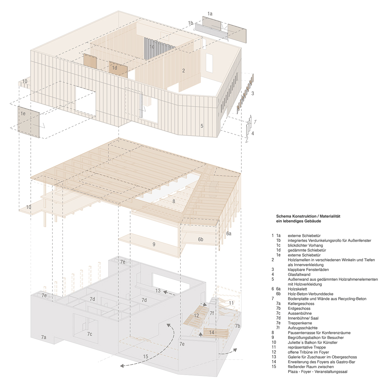 Das Gebäude wird in Holz-Hybrid-Bauweise geplant. Das Kellergeschoss, das Erdgeschoss mit Saal und Bühne sowie die Treppenkerne und Aufzugsschächte bilden ein stabiles Fundament aus Recycling-Beton. Die restliche Tragstruktur einschließlich der Dachkonstruktion wird in Holzbauweise ausgeführt. In den Büro- und Konferenzbereichen erhalten die Innenwände einen Lehmputz.