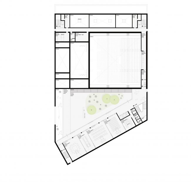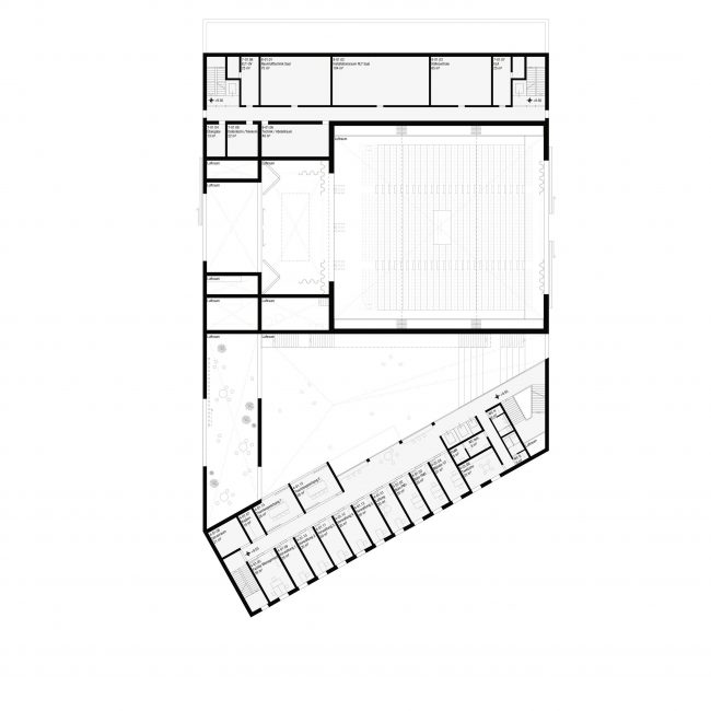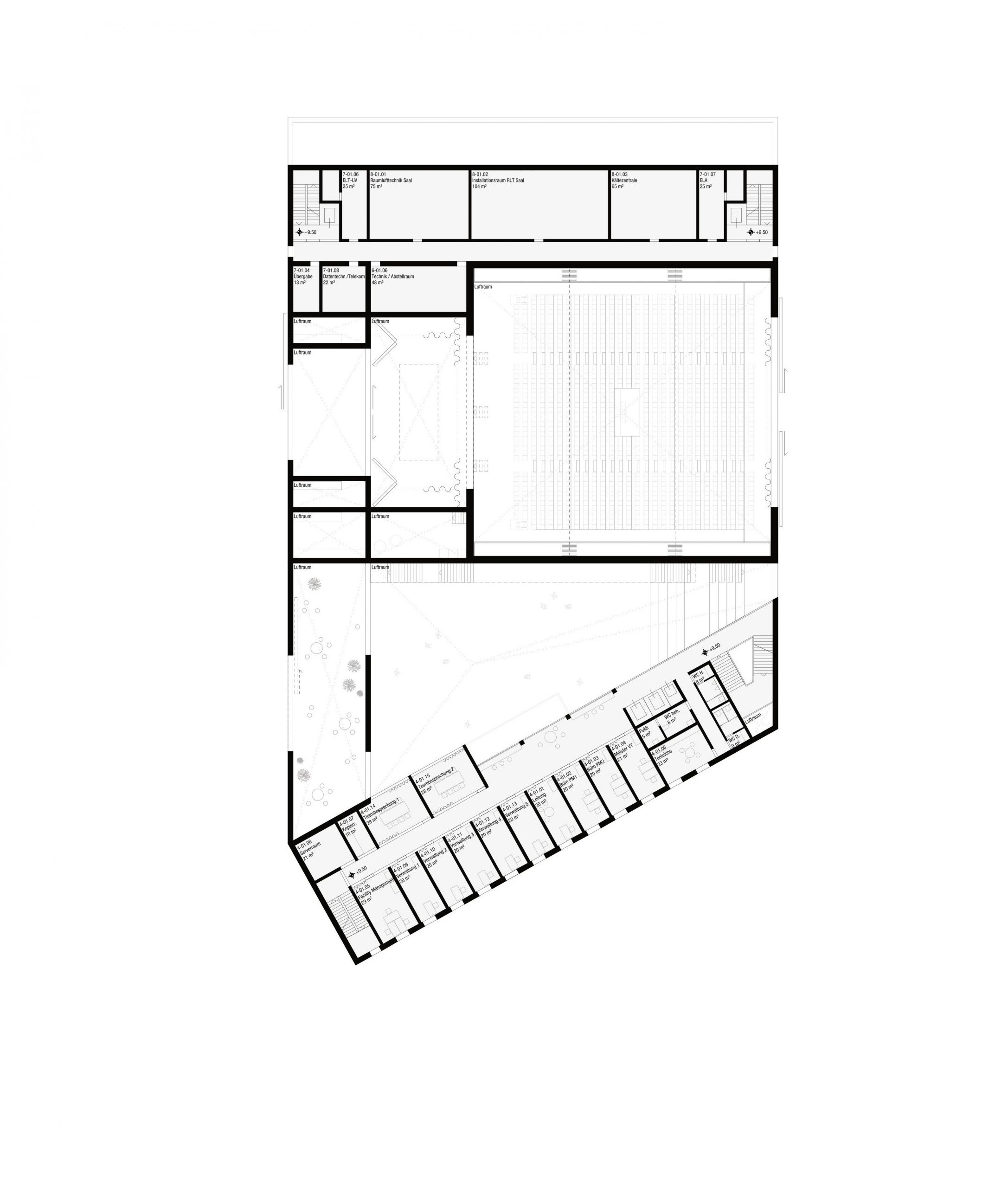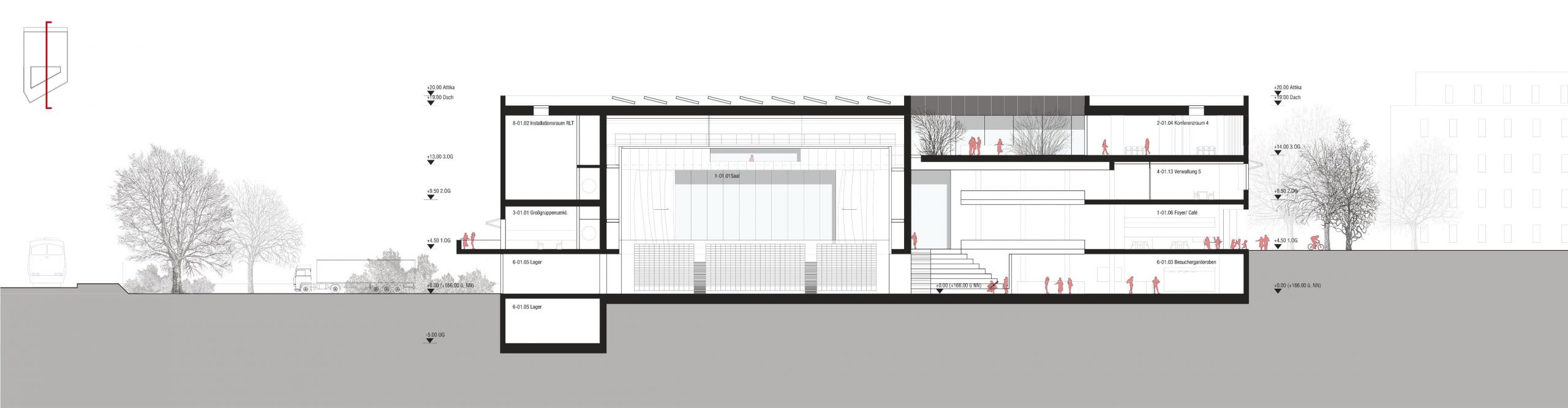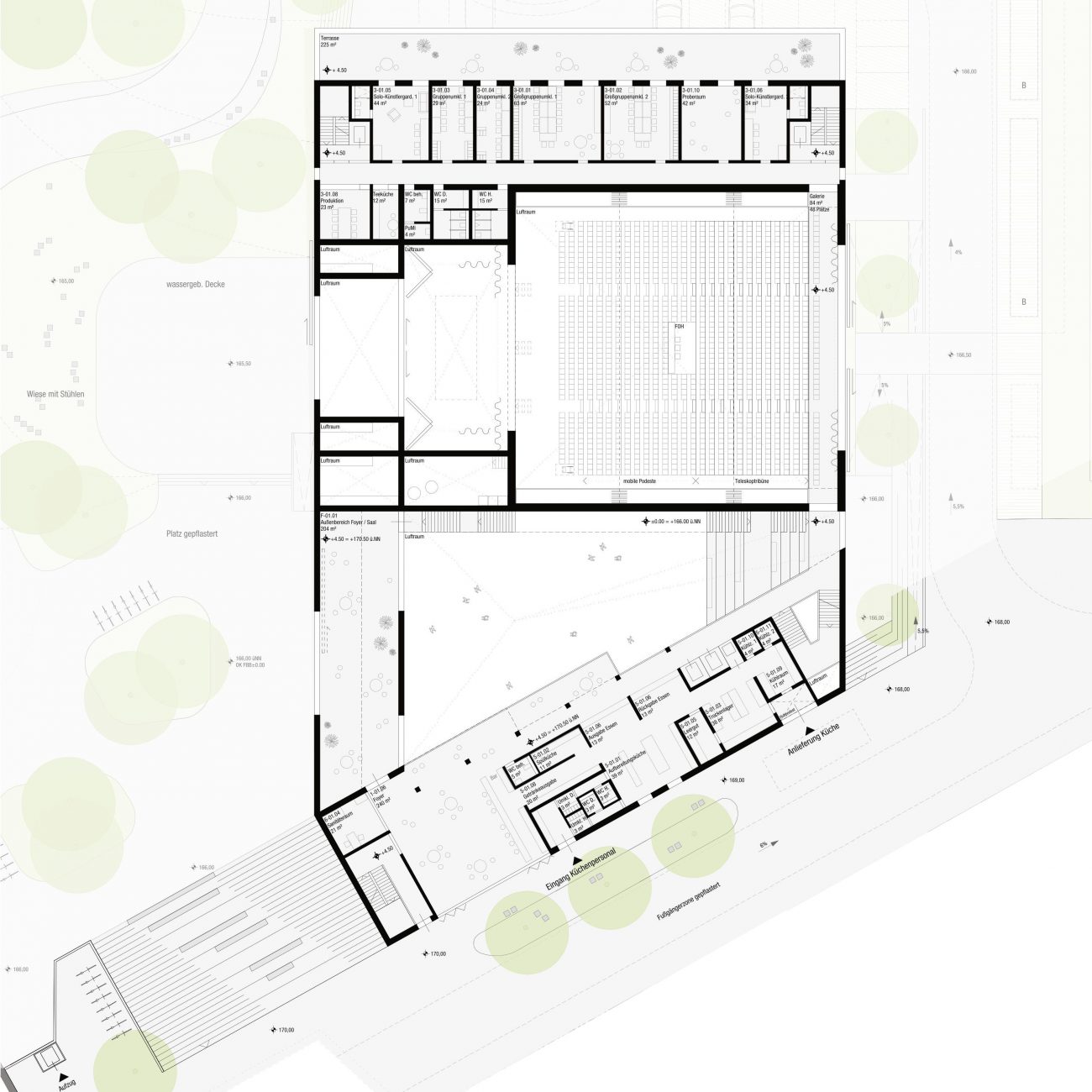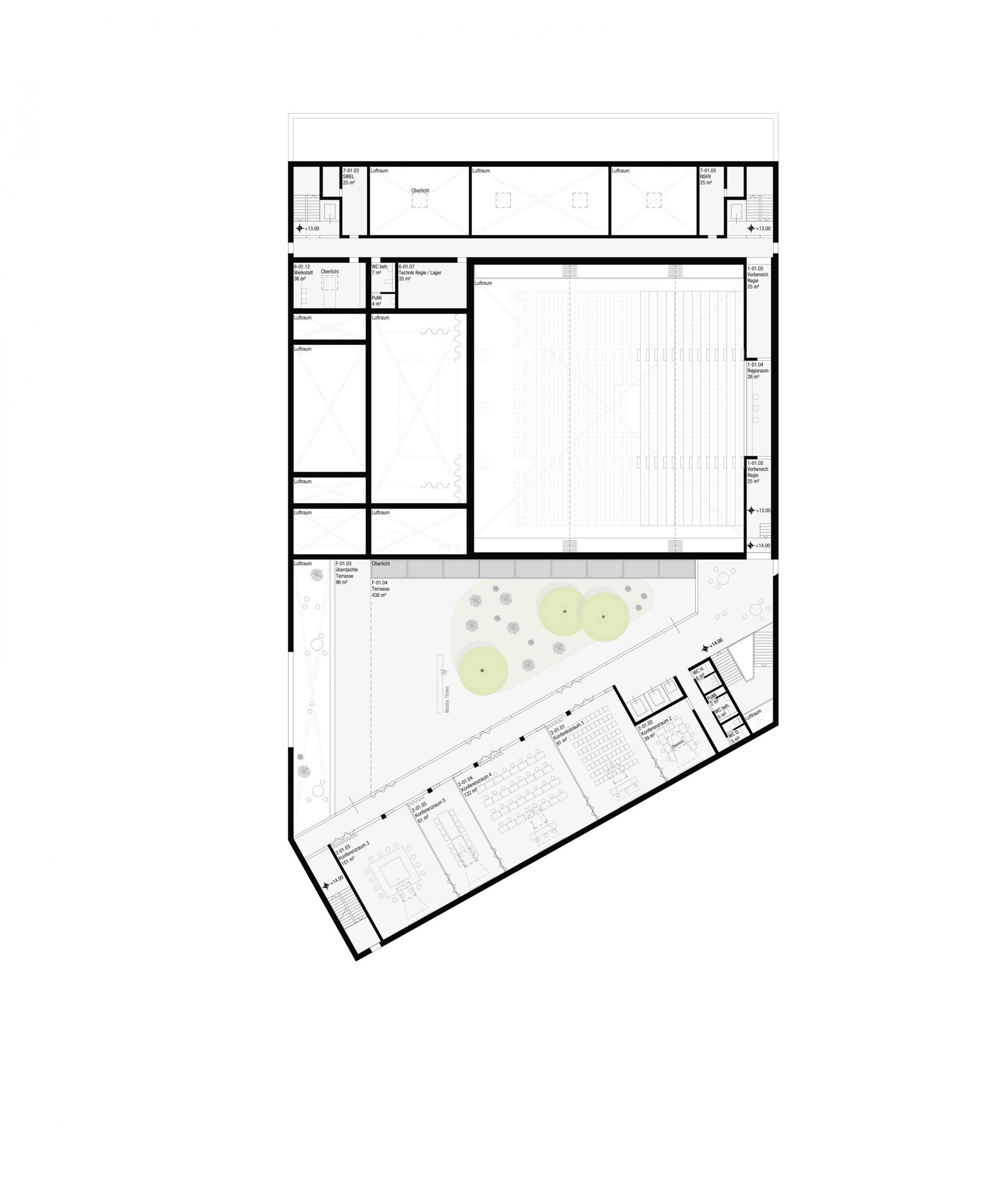 Im Süden liegen der Saal und die Gastronomie, die an das zentrale Foyer anschließen. Der Verwaltungstrakt befindet sich über der Gastronomie, und die Konferenzräume in der obersten Etage öffnen sich zur Dachterrasse, die als Pausen- und Freifläche dient. Verschiedene Nutzungs- und Abtrennungsszenarien sind möglich, und die räumliche Trennung zwischen Konferenzbereich und Saal ermöglicht parallele Nutzungen.