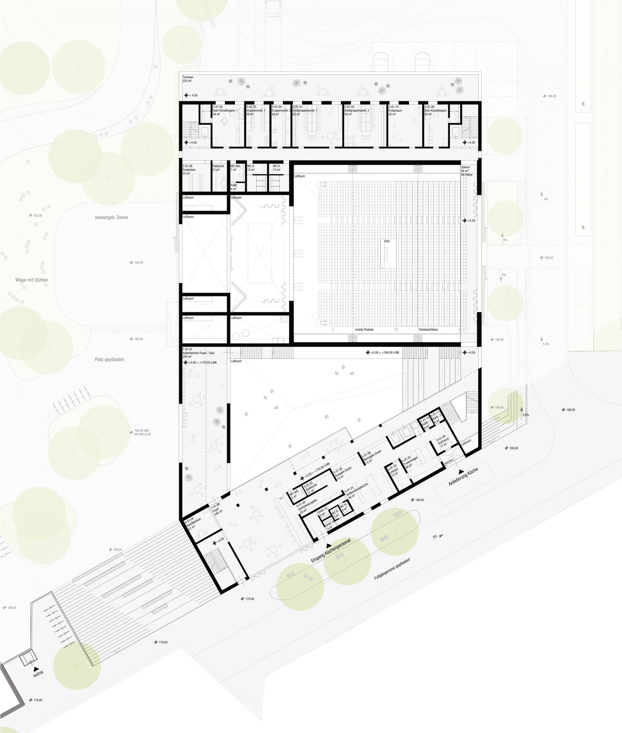 Das räumliche Erleben des City Forums beginnt in seiner Mitte. Die Plaza führt vom Haupteingang zum zentralen Atrium, das Einblicke in alle Funktionsbereiche bietet. Im Norden befinden sich der Künstlerbereich, die Bühnenanlieferung sowie Lager- und Technikräume.