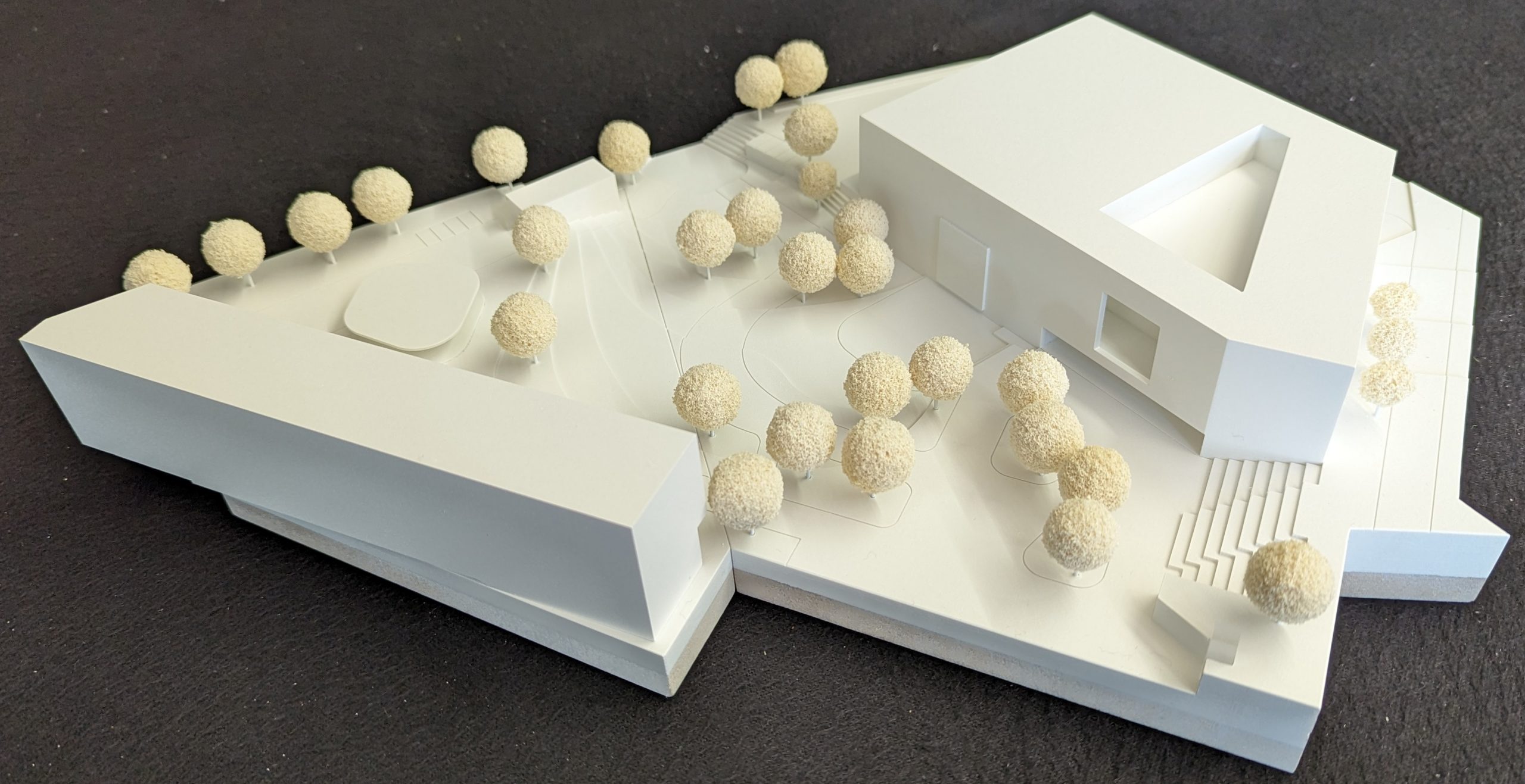 Der Stadtplatz bietet durch Bauminseln und Sitzgelegenheiten hohe Aufenthaltsqualität und genug Platz für saisonale Angebote (Marktstände, Weihnachtsbaumverkauf etc.). Helle Platten auf dem Vorplatz passen farblich zum Rathaus und kontrastieren das City Forum, während klimatolerante Bäume den Quartiersplatz und die parkartige Wiese bereichern.