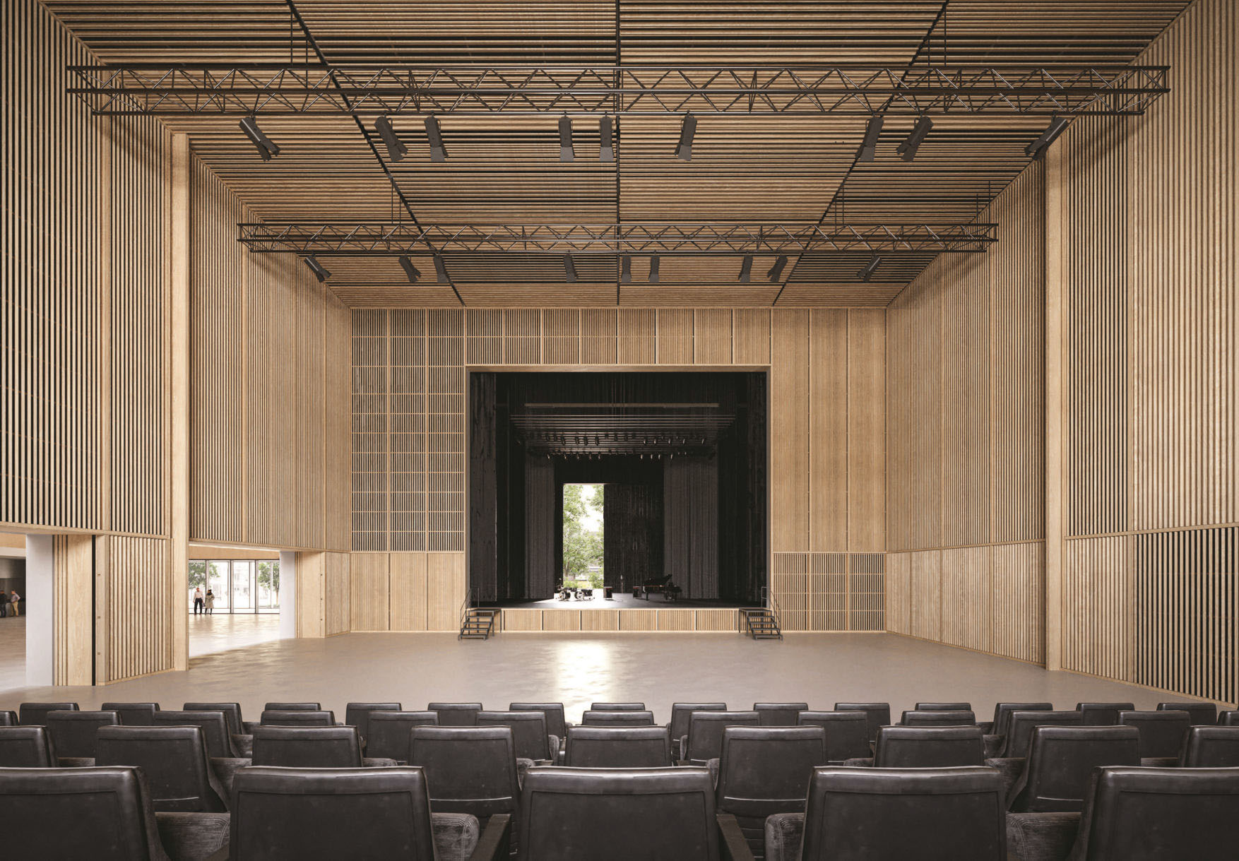 Der Saal ist als Blackbox in Massivbauweise für gute Schalldämmung konzipiert. Die rückseitige Außenbühne und große Flügeltore ermöglichen es, das Gebäude im Südwesten zur Plaza zu öffnen und für Freiluftaufführungen zu erweitern. Die Plaza wird so temporär zum Kulturraum. Der Saal kann zudem mit mobilen Akustikelementen geteilt und zum Foyer hin geöffnet werden. Die akustisch wirksamen Wände und Decken unterstützen verschiedene Nutzungen wie Konzerte, Theateraufführungen, Tagungen und Bankette.