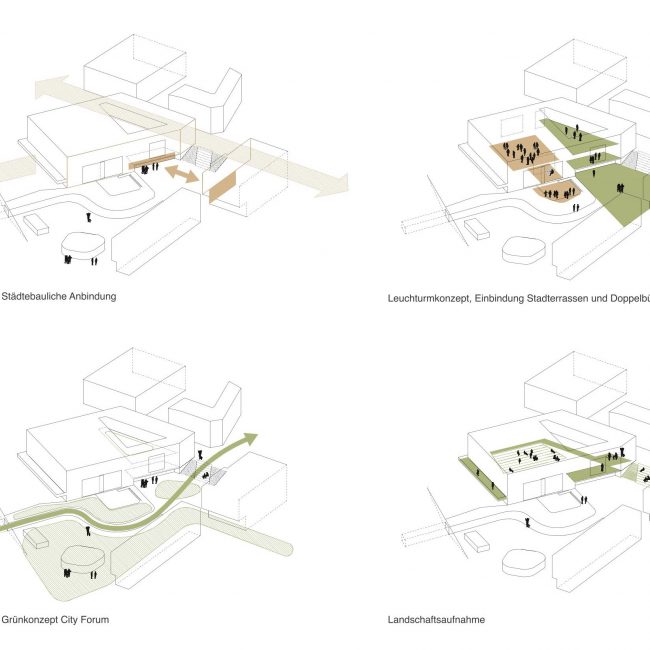 Grundidee für den Neubau ist eine Symbiose aus Städtebau, Architektur und Landschaft. Das neue City Forum thematisiert die ansteigende Topografie, indem sich das Bauvolumen darin einfügt. Durch Ecken und Verlaufssprünge stellt das Gebäude eine Abstraktion der Landschaft dar, und staffelt sich vom Eingangsniveau über das Foyer bis zur Terrasse und schließlich zur Dachterrasse.