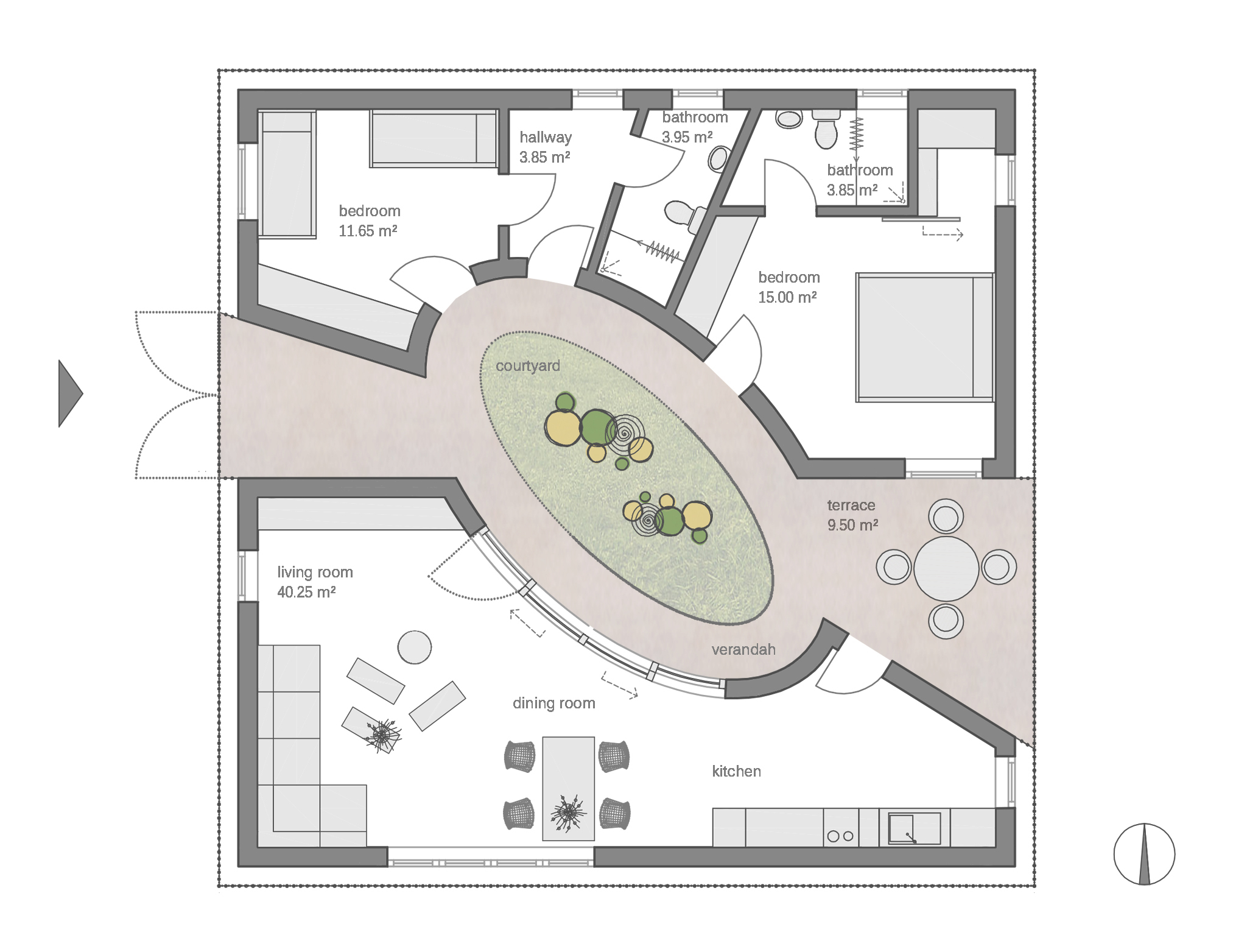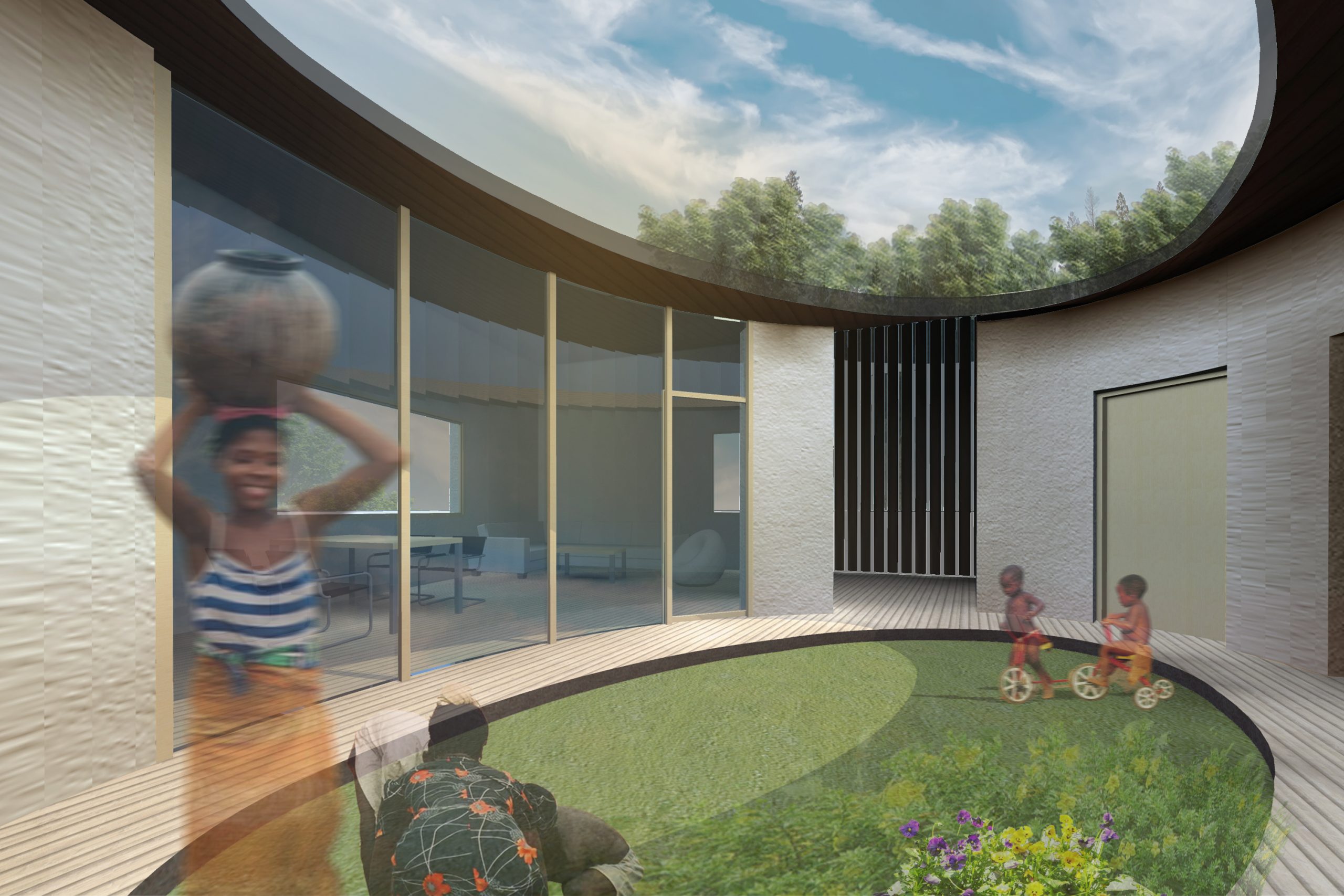 Die Gestaltung dieser Wohnung wurde von der traditionellen Architektur des Lozi-Volkes inspiriert. Die Lozi sind ein indigener Stamm, der entlang des Sambesi in der westlichen Provinz Barotse ansässig ist. In den meisten Gehöftgrundrissen ist eine klare Trennung zwischen sozialen und funktionalen Bereichen erkennbar, mit verschiedenen Hütten für jede Funktion (Sozialbereich, Kochbereich, Haupthaus, Getreidespeicher und Latrine). Diese sind von einem Zaun umgeben und mit einer baumähnlichen Struktur versehen. Durch die Verschärfung der Beziehung zwischen den Räumen wurde ein kompaktes Design entwickelt, das alle Funktionen um einen zentralen Innenhof gruppiert. So entsteht ein grünes Atrium, das groß genug ist, um große Familientreffen und Veranstaltungen anzunehmen, als Spiegelbild der alten Tradition des Volkes, sich unter einem Baum zu versammeln.